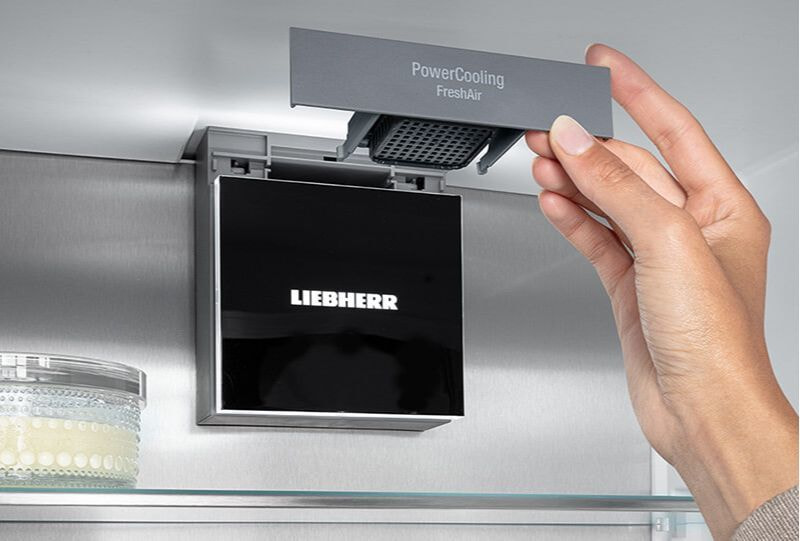 消臭効果のある、FreshAir活性炭フィルターが搭載されています。フィルターはファンハウジング内部に搭載されていて、新鮮な空気を庫内に供給します。交換時期が近づくと、ディスプレイでお知らせします。